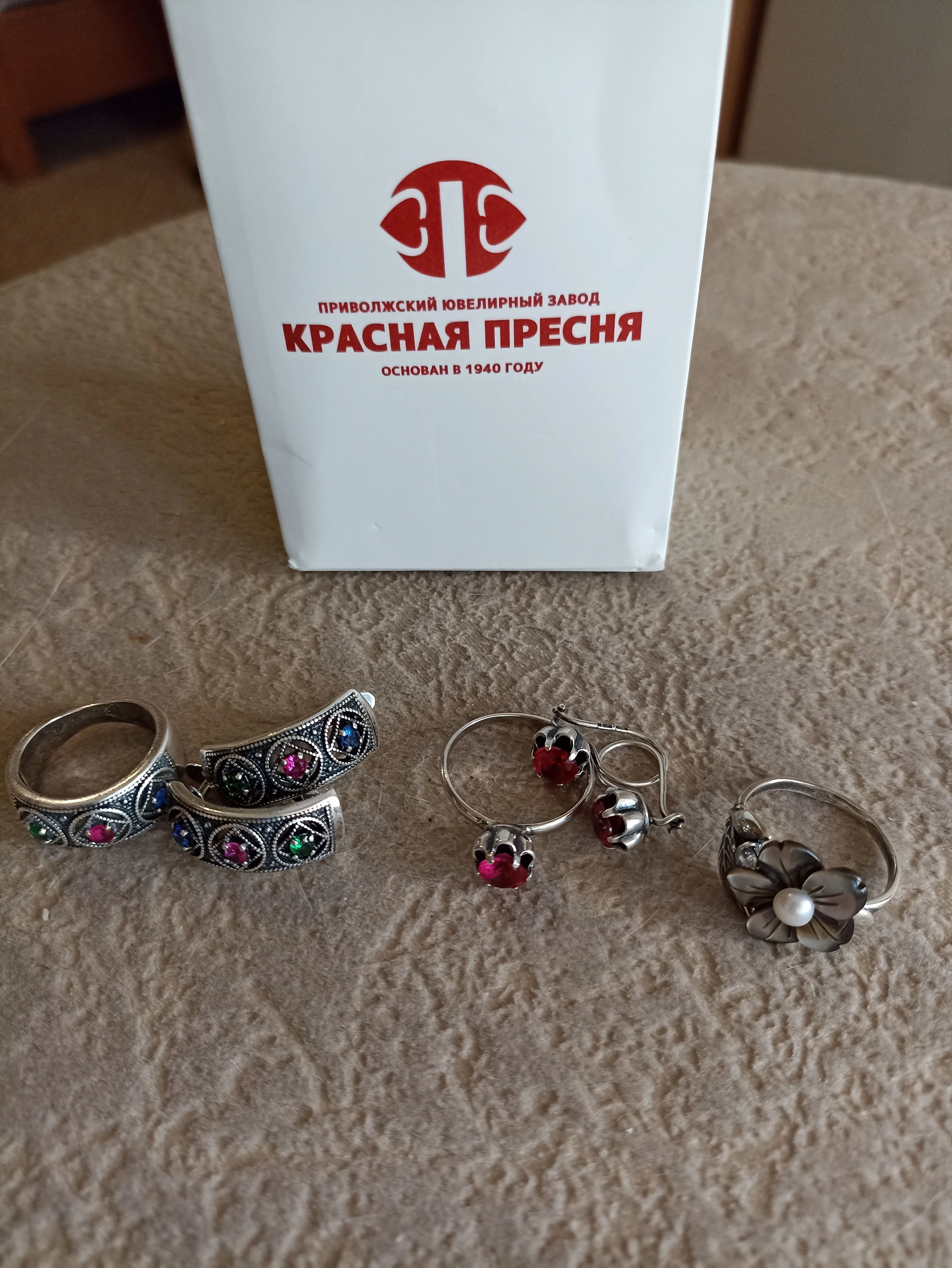 Здравствуйте. У меня от "Красной пресни" вот такая красота: два набора (кольцо и серьги) и кольцо с перламутром. Я очень довольна дизайном и качеством! Буду заказывать еще.