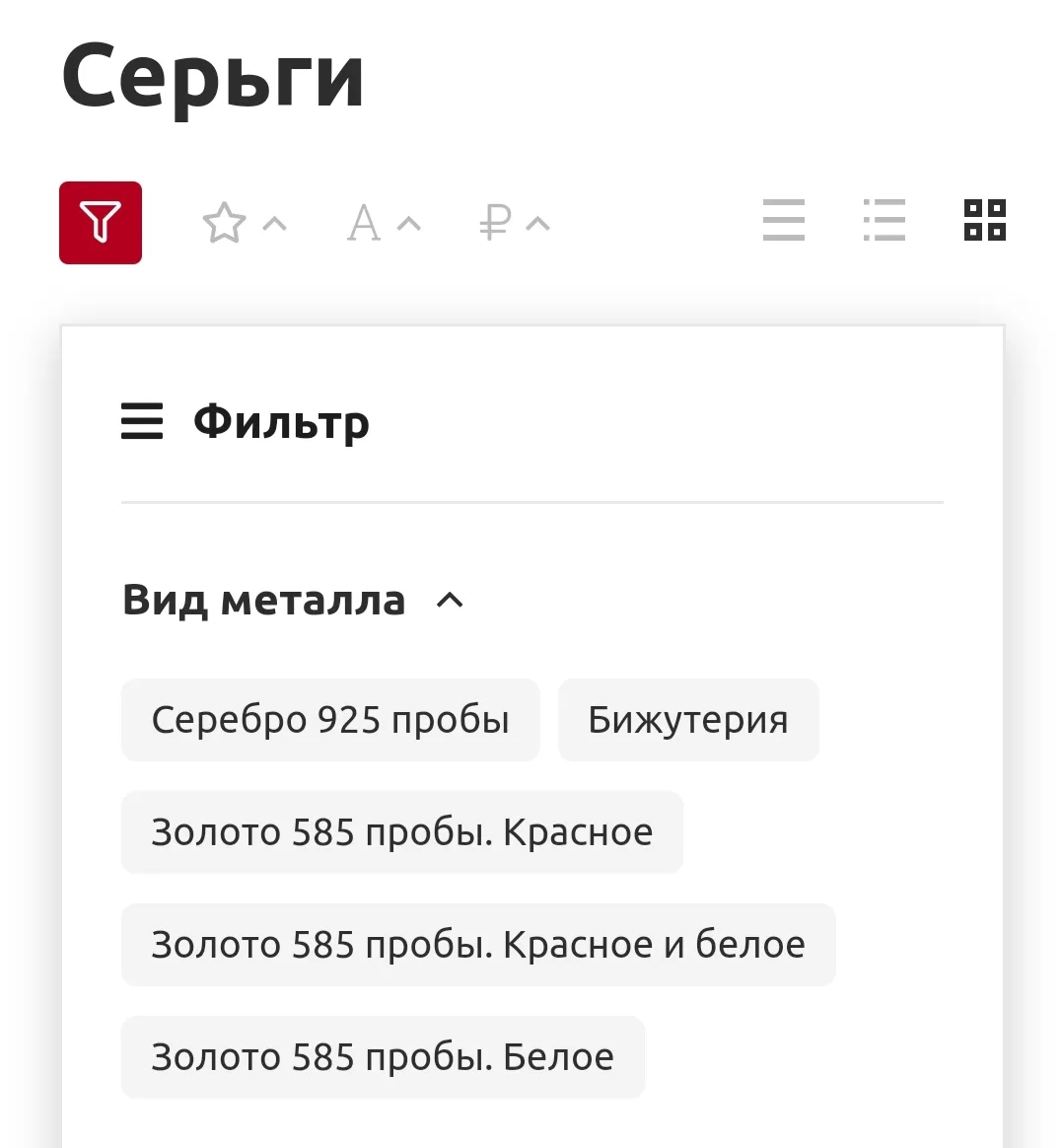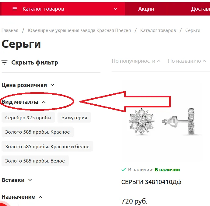 При входе с компьютера можно воспользоваться фильтром в левой части экрана. С его помощью можно выбрать вид металла, вставки, размеры и многое другое.